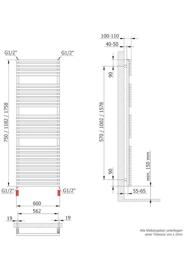- Empfehlung bei einer Höhe von 1758 mm: 900 Watt