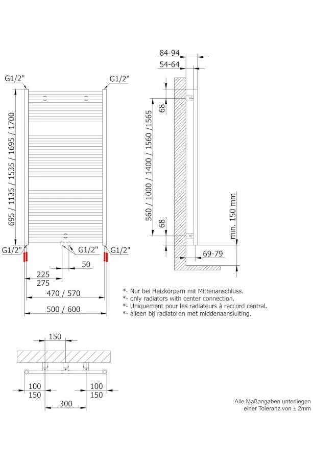 - Empfehlung bei einer Höhe von 1695 mm, Breite von 500 mm: 600 Watt