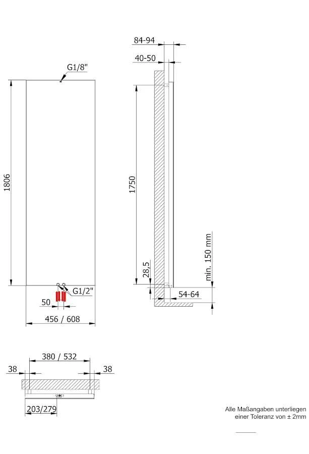 - Wandabstand bei mittigem Anschluss: 50 mm